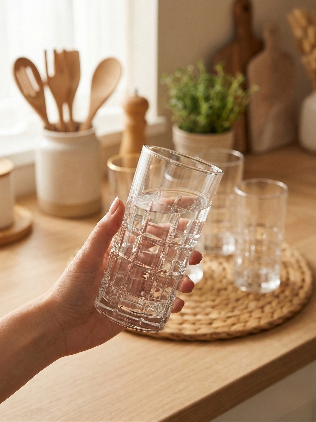 A uniquely designed glass cup with a modern faceted shape—perfect for serving tea, coffee, or...