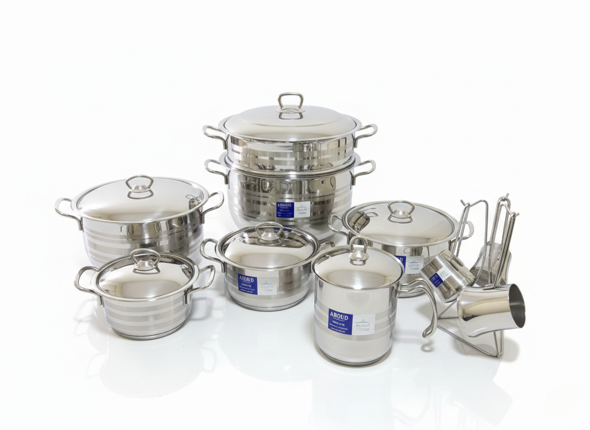 التصميم: يتميز بسطح مخطط أنيق مع تشطيب مصقول. يأتي كل وعاء مع غطاء من الفولاذ المقاوم للصدأ ومقابض جانبية قوية لسهولة التعامل بأمان وراحة. يجمع الطقم بين المرونة مع جمالية نظيفة وعصرية تناسب أي نمط مطبخ.