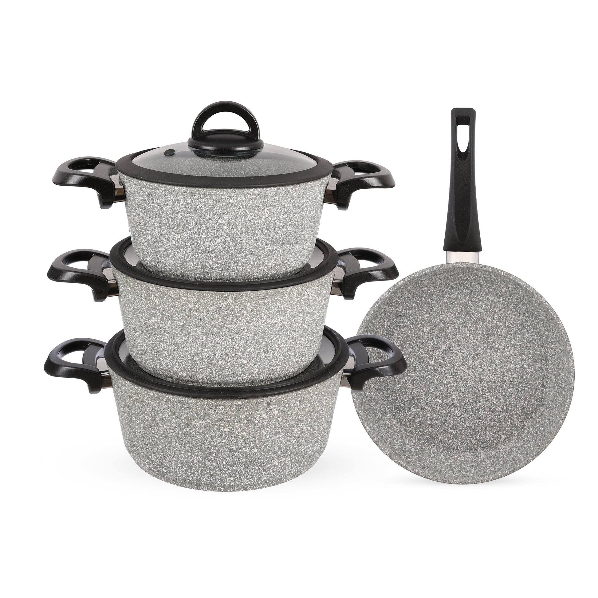 تتضمن المجموعة أربعة أوعية بأحجام مختلفة: 20 سم، 22 سم، و24 سم، مما يوفر تنوعًا لجميع إبداعاتك في الطهي. بالإضافة إلى ذلك، فهو يتميز بمقلاة مقاس 24 سم، مثالية للقلي والقلي وغير ذلك الكثير. تضمن هذه المجموعة الشاملة حصولك على أدوات الطبخ المناسبة لكل مهمة طهي.