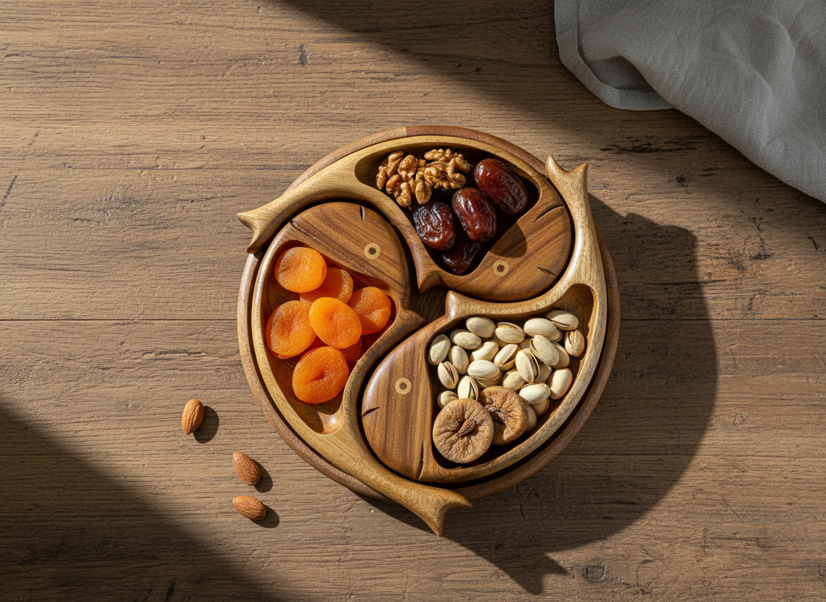 التصميم: يتميز بعدة أقسام منحوتة على شكل أجزاء سمكة، مما يسمح بفصل أنيق للمكسرات، الفواكه المجففة، أو الوجبات الخفيفة. تعطي المنحنيات الناعمة والألوان الدافئة مظهرًا ريفيًا ولكنه مصقول.