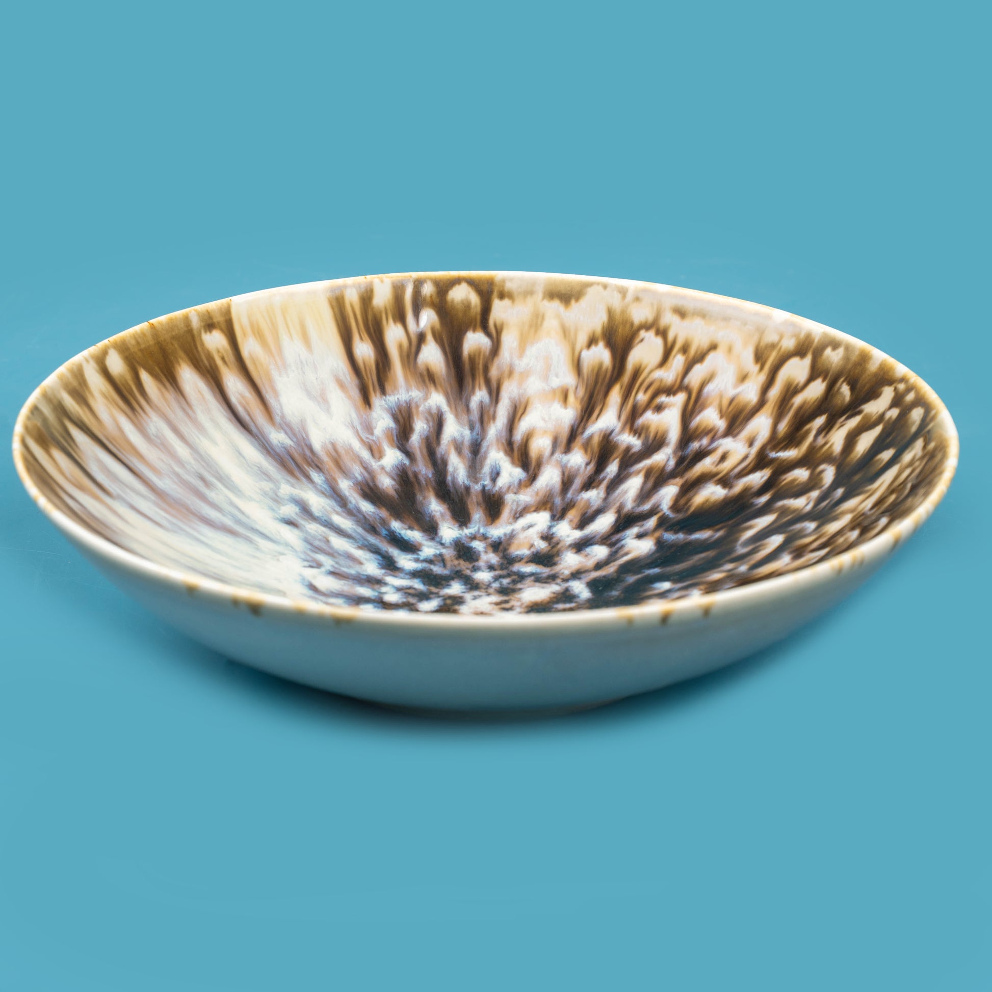 Design: Wide, shallow shape with a dramatic galaxy-style glaze in rich earth and deep blue tones; each plate has a one-of-a-kind pattern