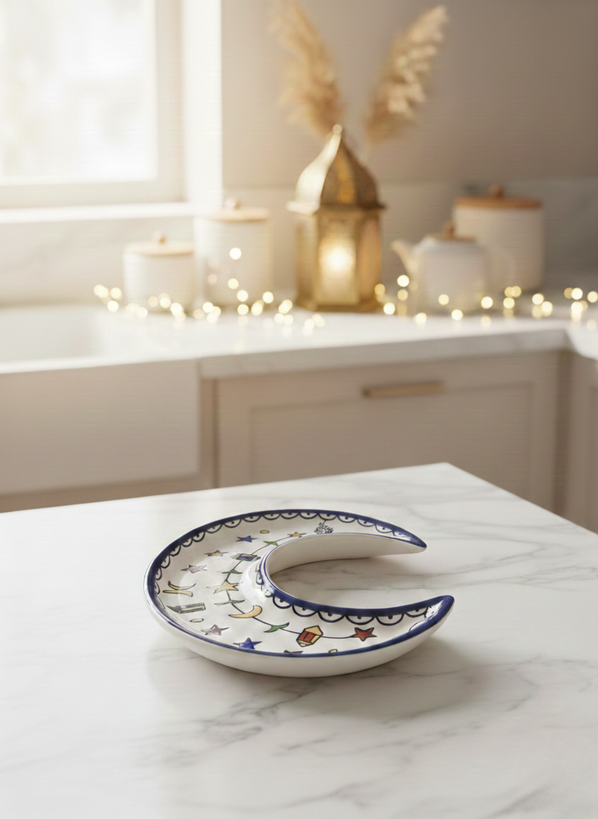 A festive crescent-shaped serving plate inspired by Ramadan nights, adorned with lanterns and stars to bring warmth, joy, and tradition to your table. A perfect blend of function and seasonal charm.