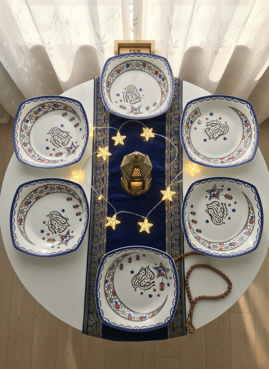 Design: Square shape with softly rounded edges, decorated with a crescent moon motif, hanging lanterns, stars, and elegant Arabic calligraphy at the center. Finished with a deep blue rim that frames the design and enhances the festive aesthetic.