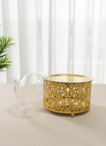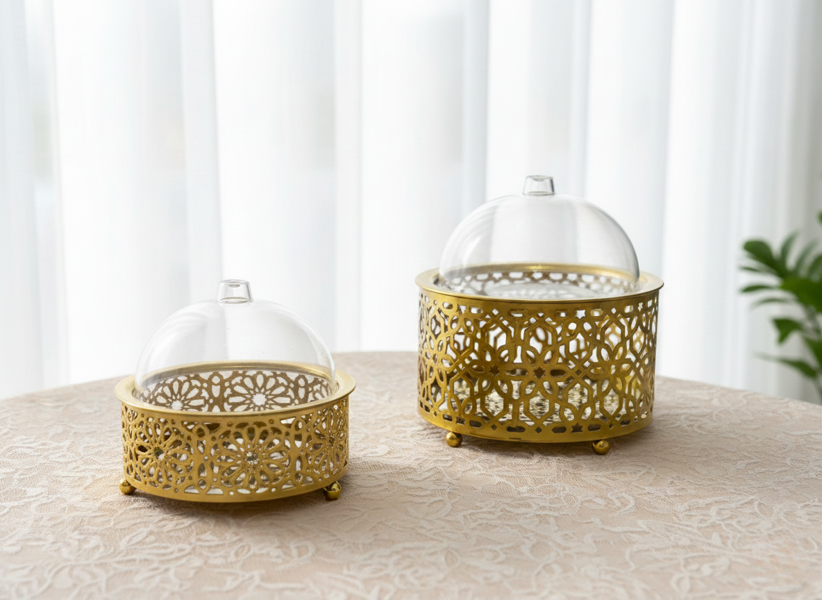 مجموعة أنيقة من صواني التقديم الدائرية مصنوعة بتصاميم عربية معقدة وبتشطيب ذهبي راقٍ. كل صينية مغطاة بقبة شفافة، مما يجعلها مثالية لتقديم الحلويات أو السكاكر أو المأكولات بطريقة أنيقة وصحية. مثالية لتجمعات رمضان، المناسبات الخاصة، أو التقديم الأنيق في الحياة اليومية.