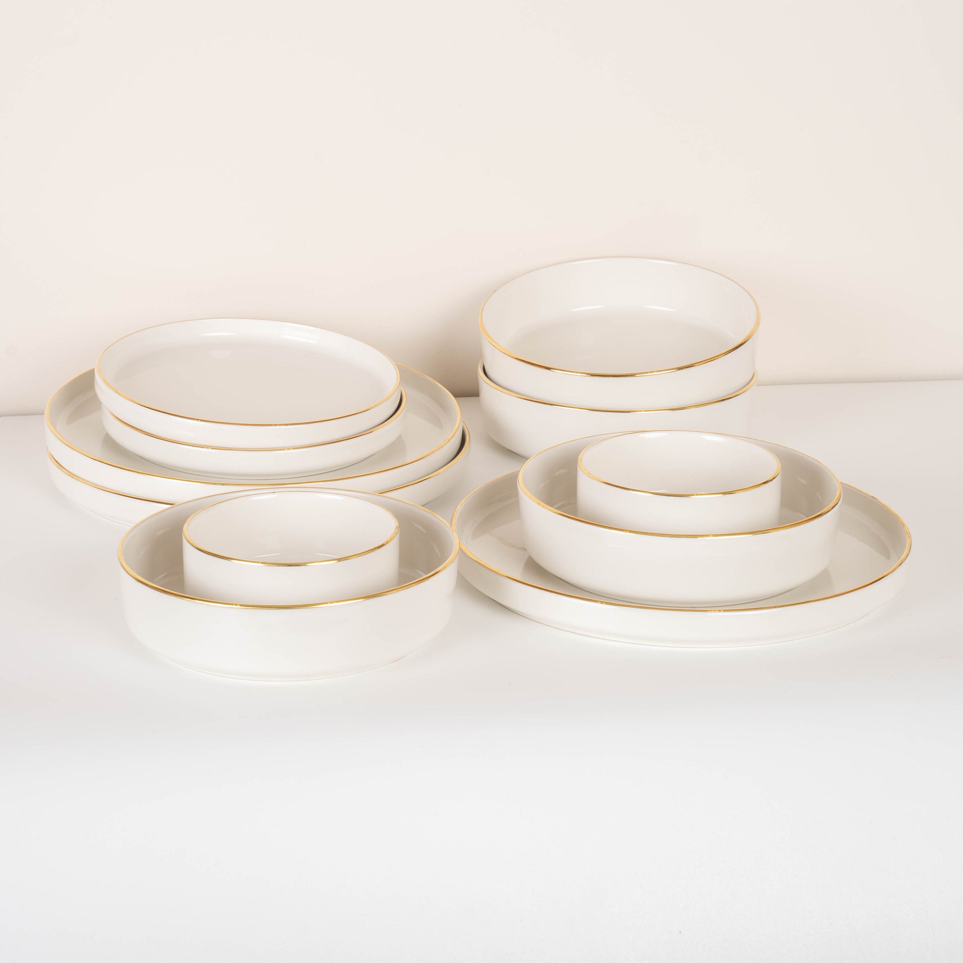 ارفع تجربتك في تناول الطعام مع مجموعة العشاء الفاخرة، المصممة لأولئك الذين يقدرون الجمال الكلاسيكي مع لمسة راقية. كل قطعة تتميز بحافة ذهبية رقيقة تضيف لمسة فاخرة إلى البورسلين الأبيض النقي - مثالية للمناسبات الرسمية، والعشاء الأنيق، أو الاحتفالات الحميمة.