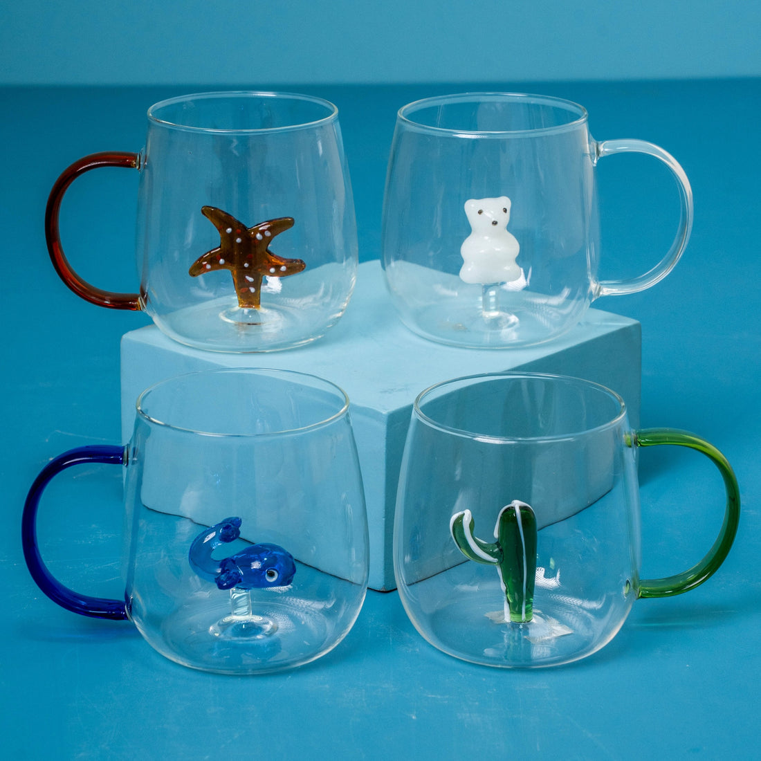 A fun and charming glass mug featuring a tiny handmade figure inside the base —...