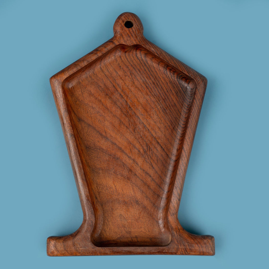 A handcrafted wooden platter with a sculpted, lantern-inspired shape that highlights the natural beauty of...