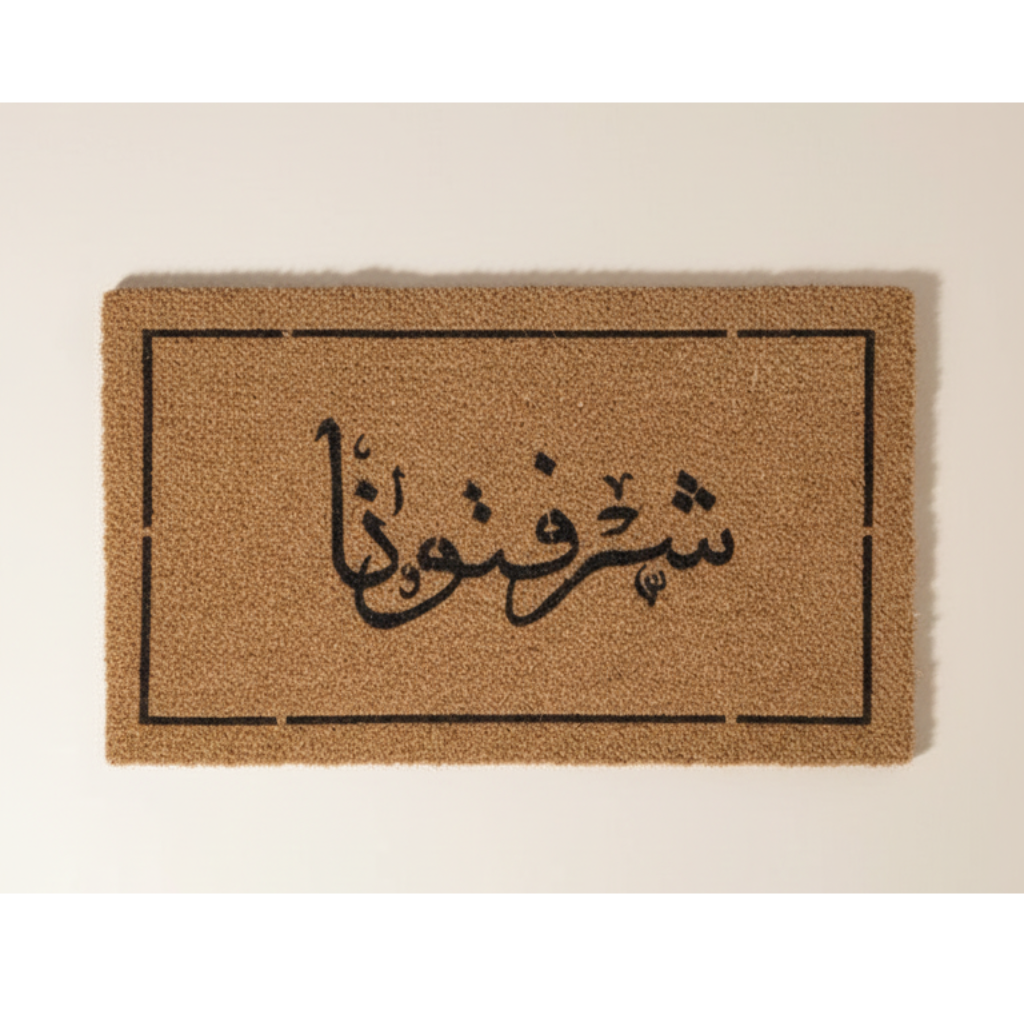 Warm Arabic Welcome: Features the elegant Arabic phrase “Sharaftona” (شرفتونا), adding a welcoming and cultural...