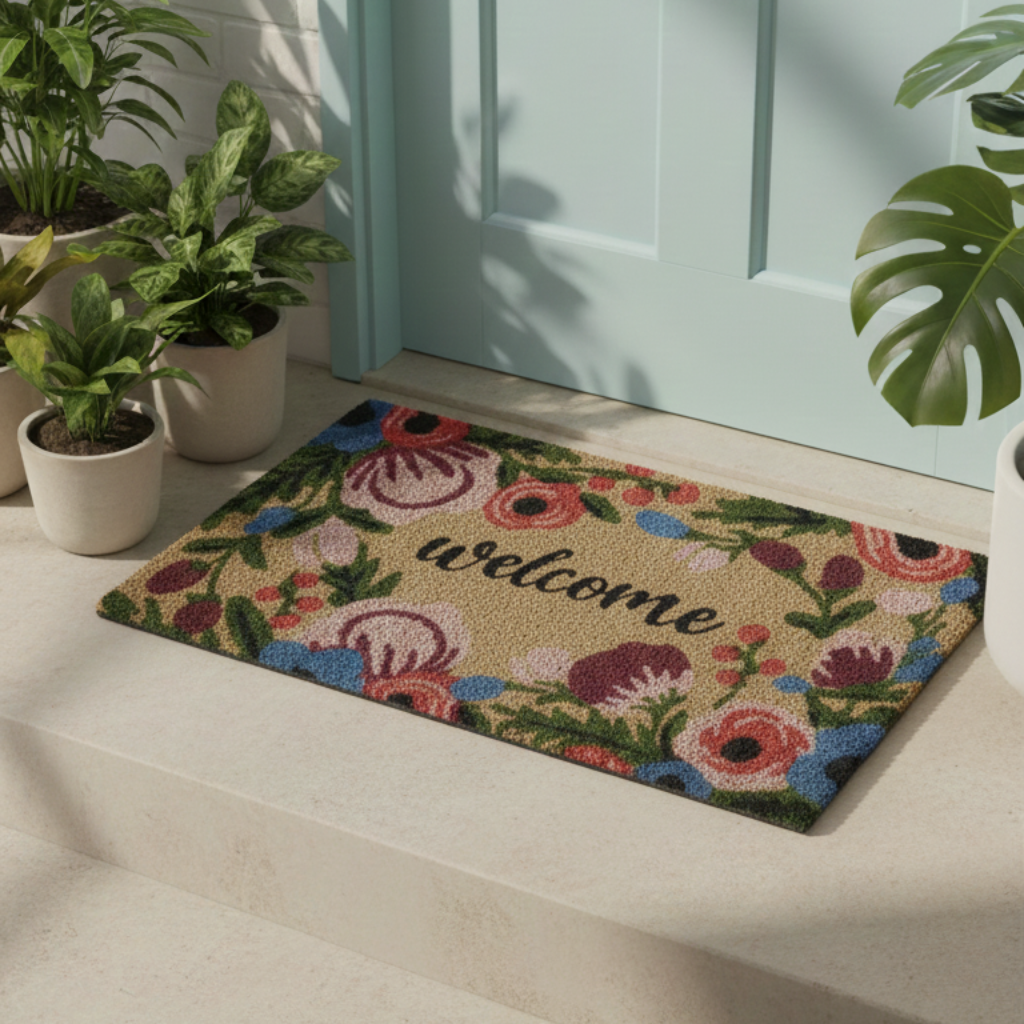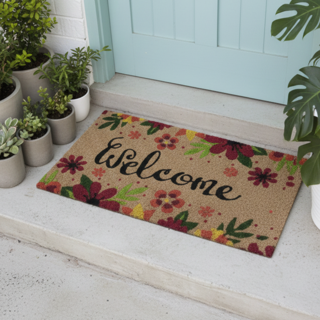 Charming Welcome Design: Features the word “Welcome” surrounded by colorful floral patterns, creating a warm...
