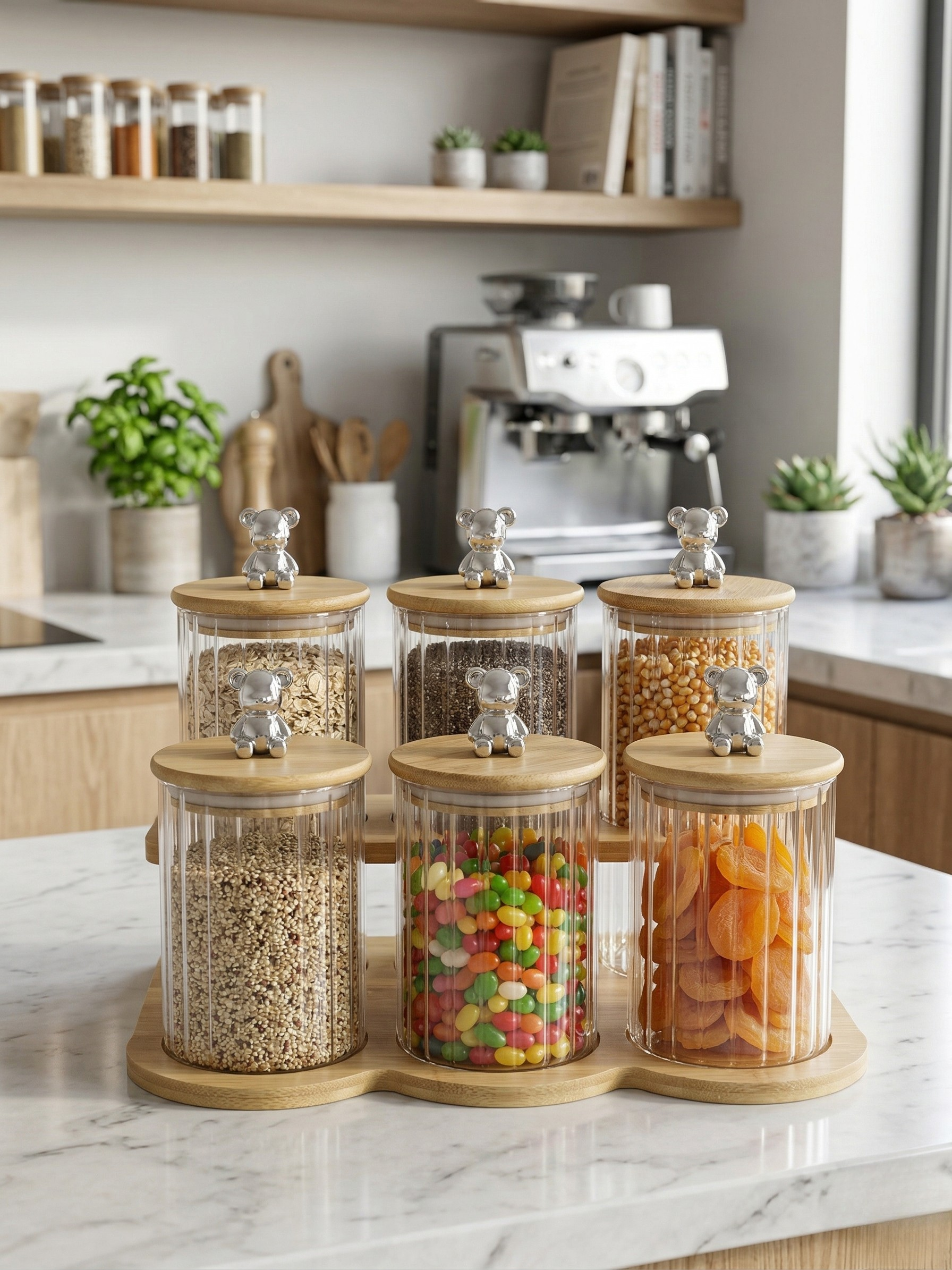 A charming and highly organized 6-Pieces Wood Storage Set featuring ribbed glass canisters and natural wooden lids—perfect for storing spices, grains, or kitchen essentials with a playful, modern touch.