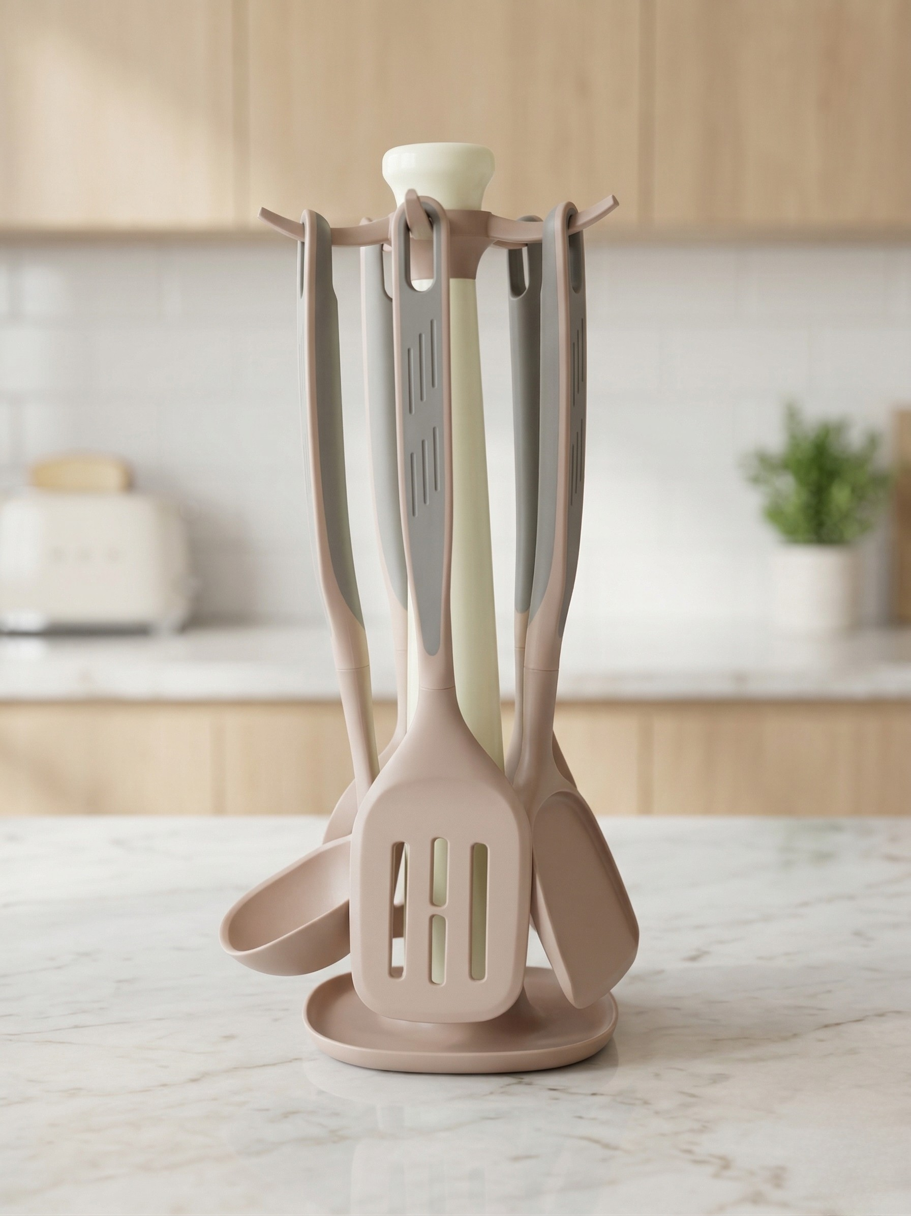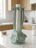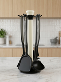 A modern and practical kitchen utensil set designed for everyday cooking—featuring a sleek design with comfortable grips and a rotating stand for easy access and organized storage. Available in black, white, pistachio, and rose to suit different kitchen styles.