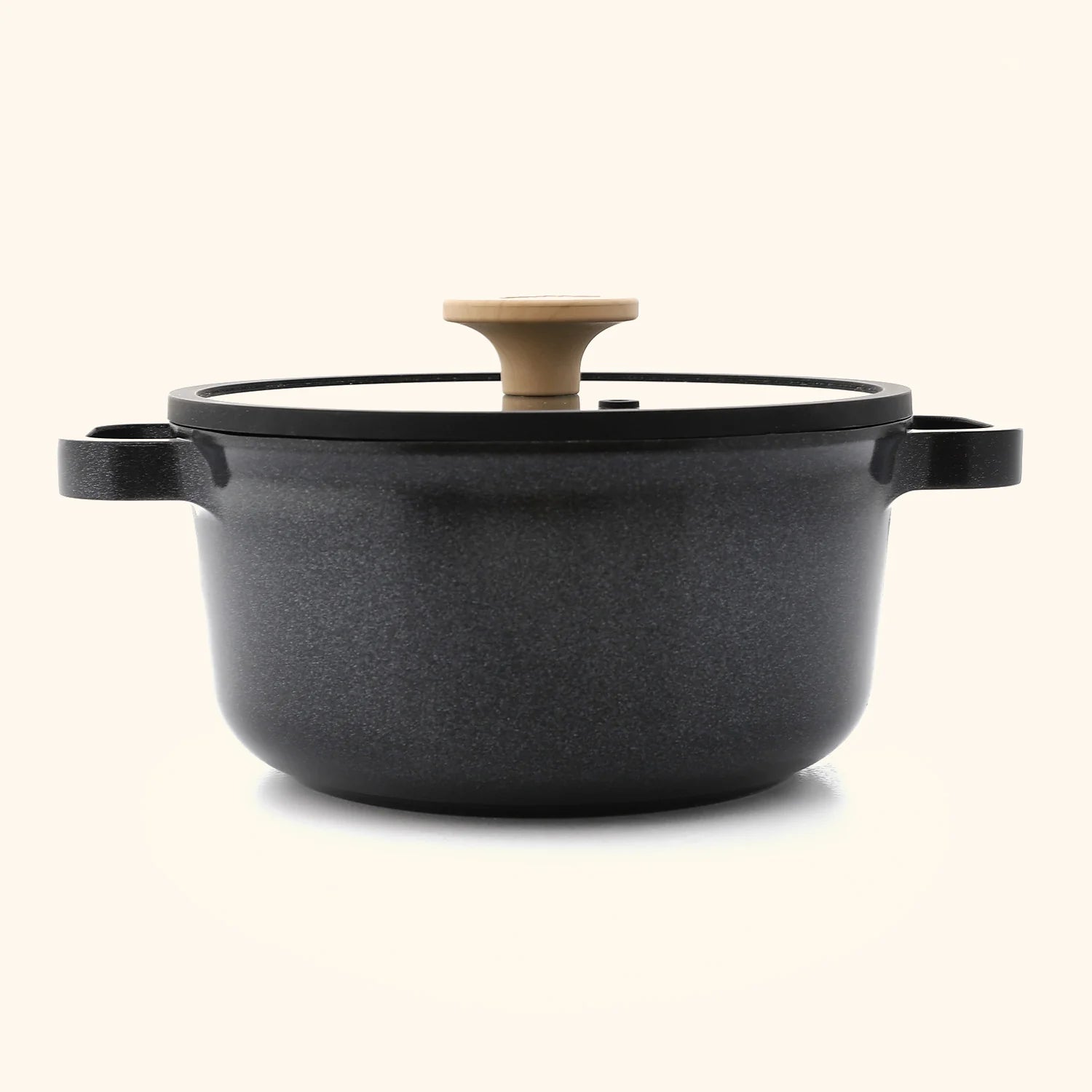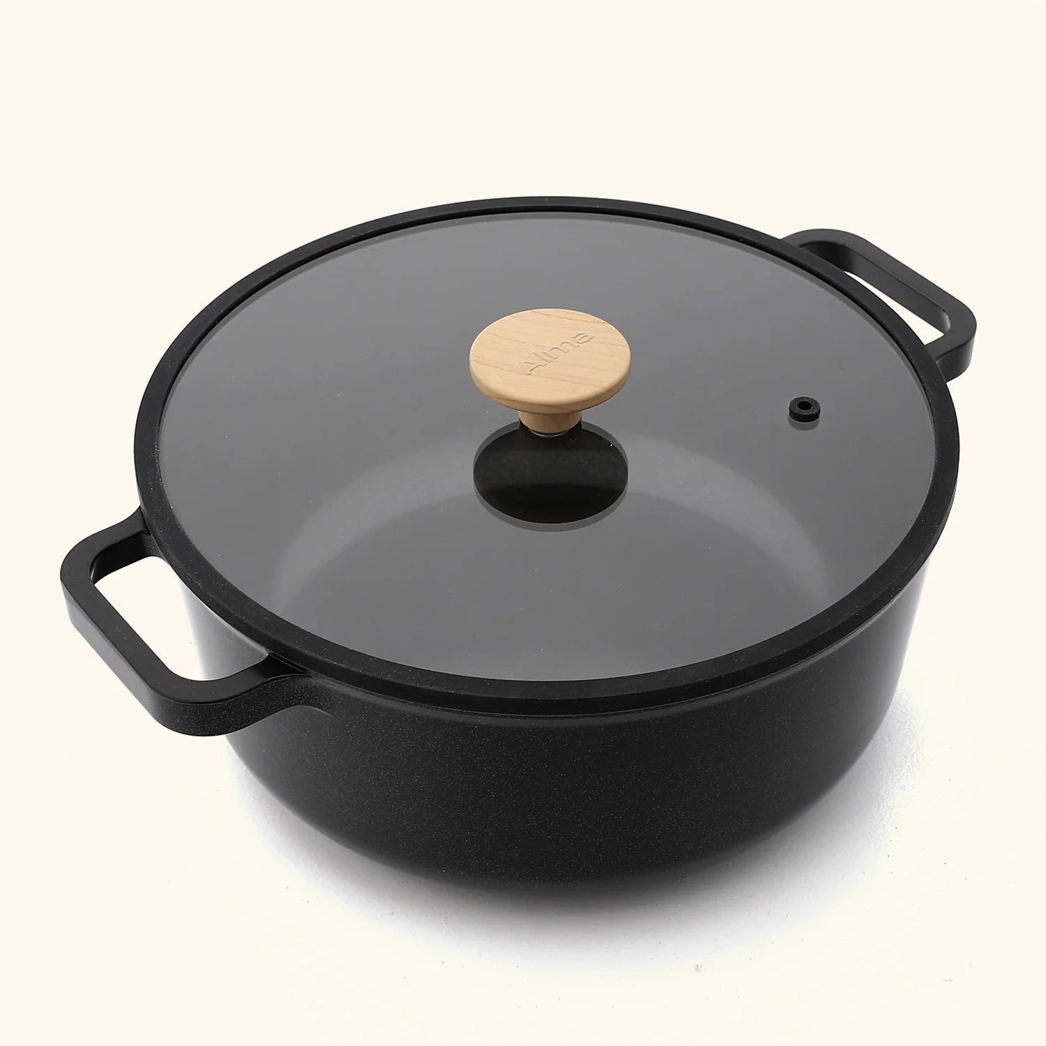 Material: High-quality aluminum body with ceramic non-stick coating and a heat-resistant glass lid with wooden knob