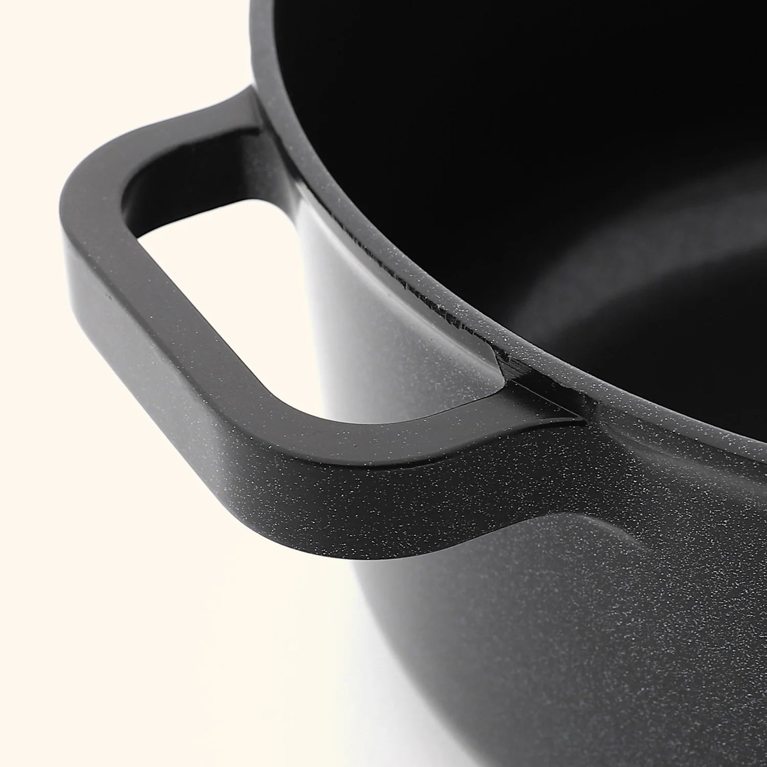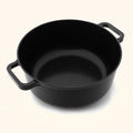 Design: Contemporary rounded form in a matte black finish with sturdy ergonomic side handles for secure handling.