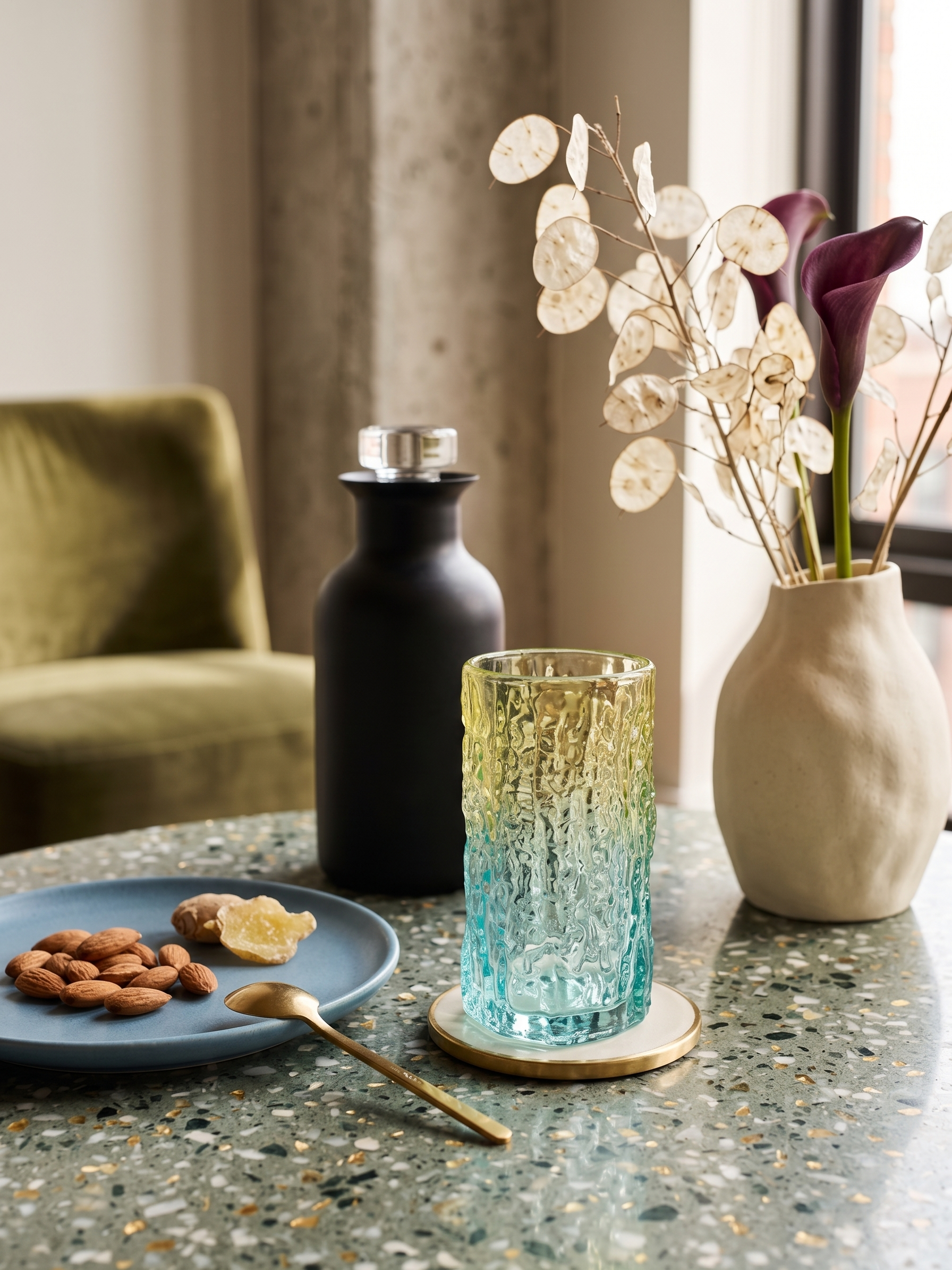 The Cobalt Glass Cup is a striking blend of modern minimalism and bold color. Perfect for serving water, iced tea, or vibrant cocktails, this 300 ml cup features a clean, cylindrical silhouette crafted from high-clarity glass, accented by a deep cobalt-blue base that creates a beautiful gradient effect when filled.