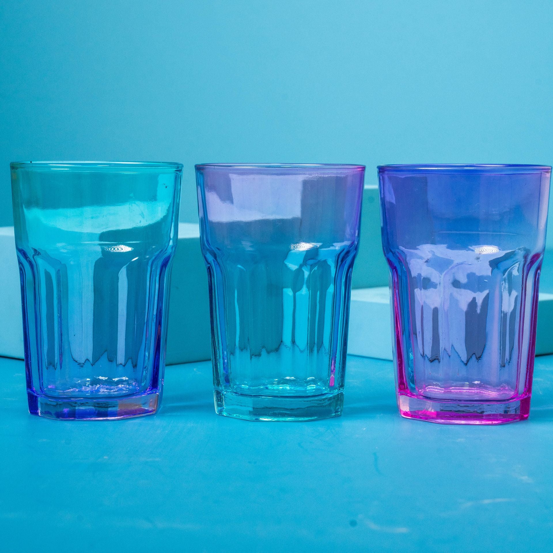 Add a playful and modern touch to your drinkware collection with the Double Colored Painted Glass Cup. Each cup features a stunning two-tone gradient finish that beautifully catches the light — perfect for serving water, juice, or your favorite beverages in style.