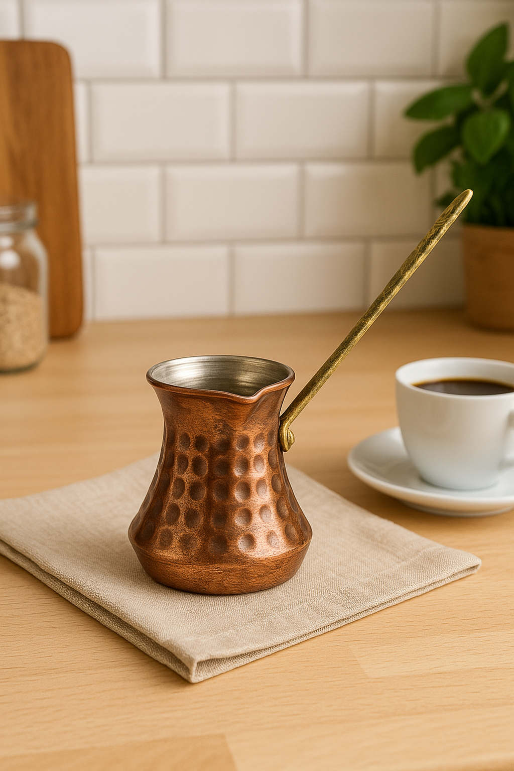Brew tradition in style with the Golden Copper Kanaka, a timeless piece designed for lovers of authentic Turkish and Arabic coffee. With its hammered copper body and elegant golden handle, this Kanaka combines heritage, beauty, and functionality in every pour.