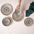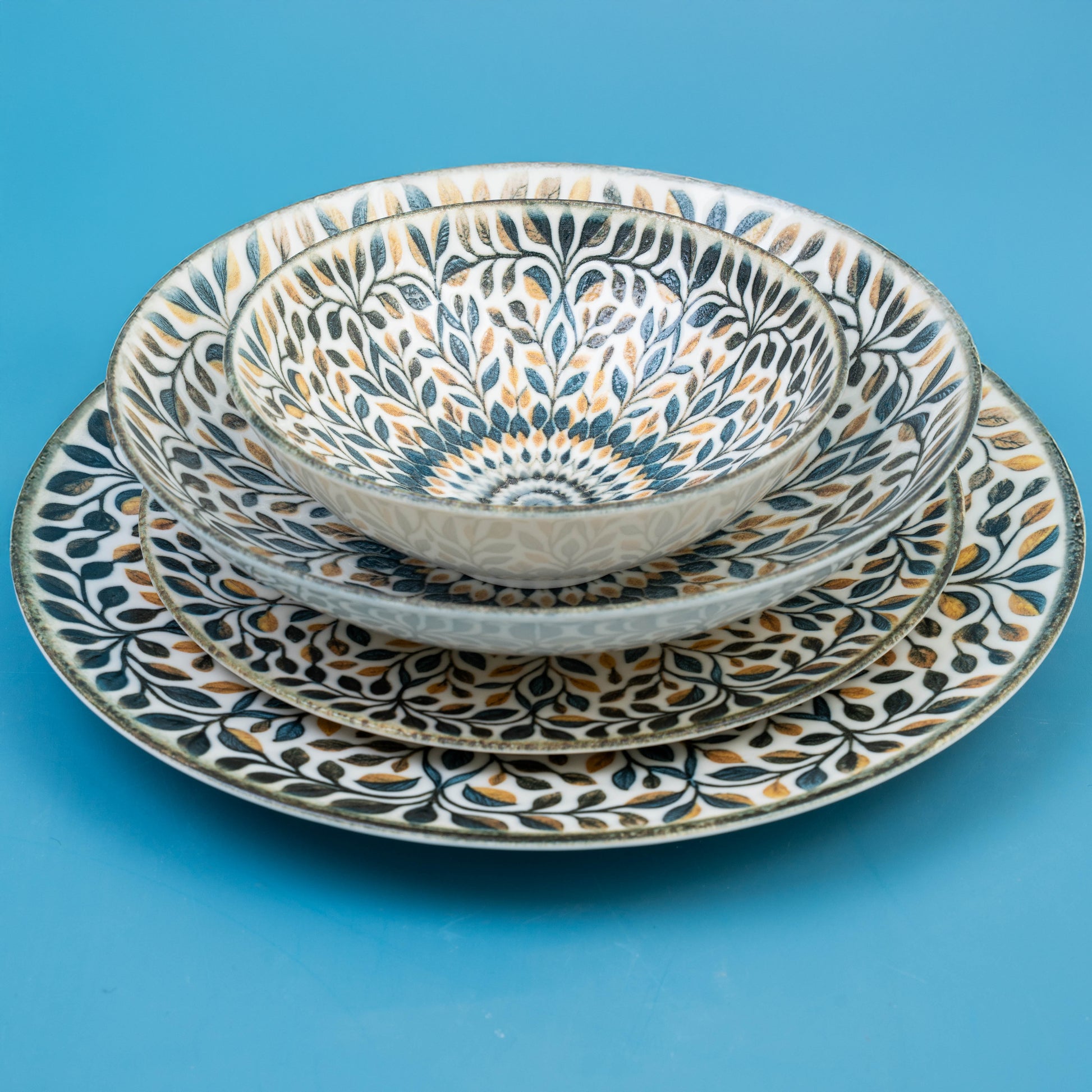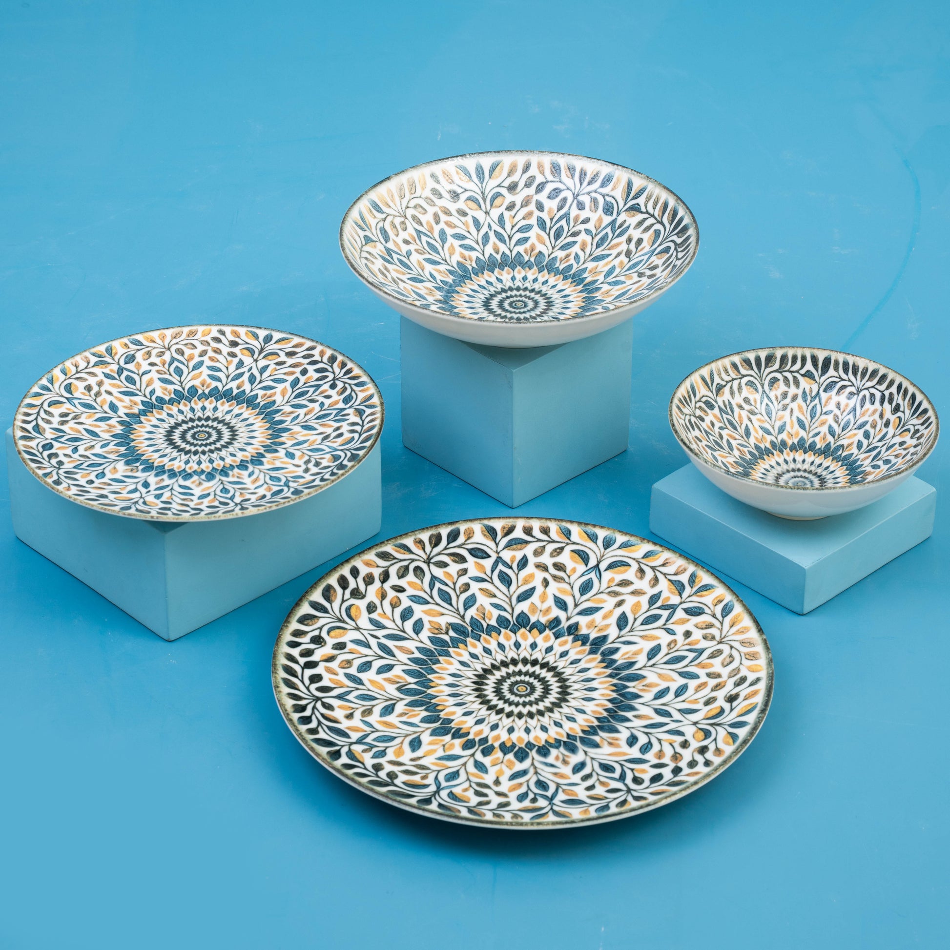 Design: The Heritage Leaf Dinner Set features a mesmerizing leaf motif arranged in a radial mandala design, blending earthy tones of beige, navy, and golden brown. Each plate is carefully crafted to reflect a sense of cultural heritage and artistic refinement — perfect for elegant gatherings or daily sophistication.