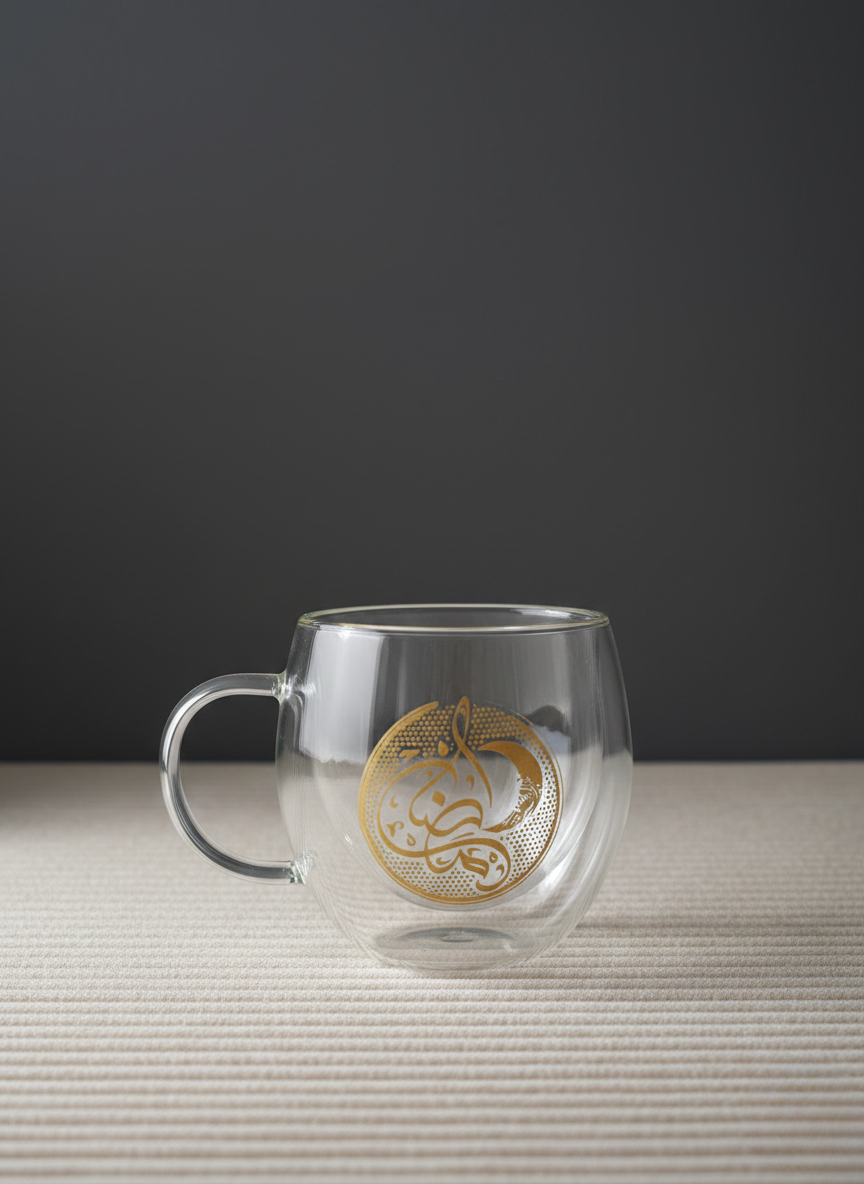 A refined clear glass mug adorned with an elegant gold Arabic motif, inspired by the warmth and beauty of festive evenings. Its delicate detailing adds a luxurious touch to every sip, making it perfect for both everyday moments and special gatherings.