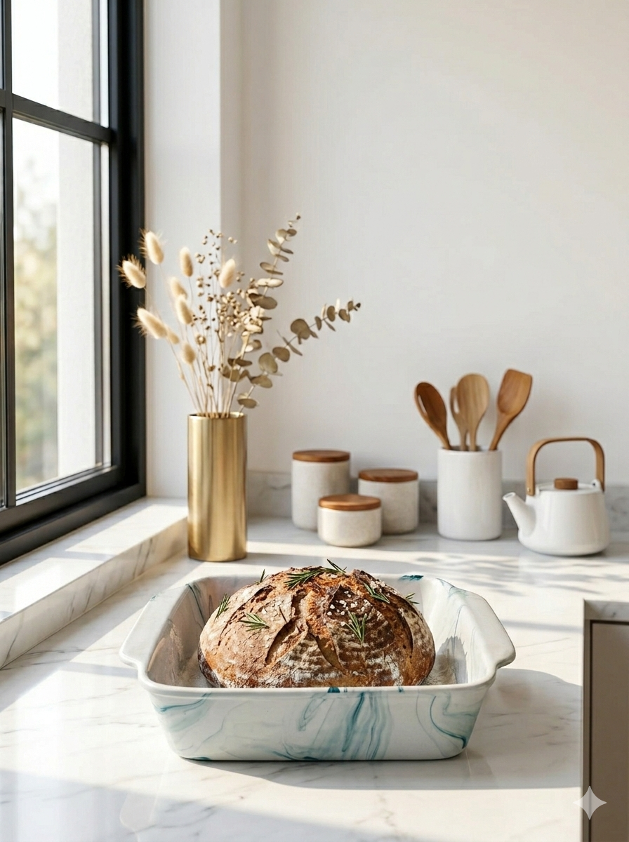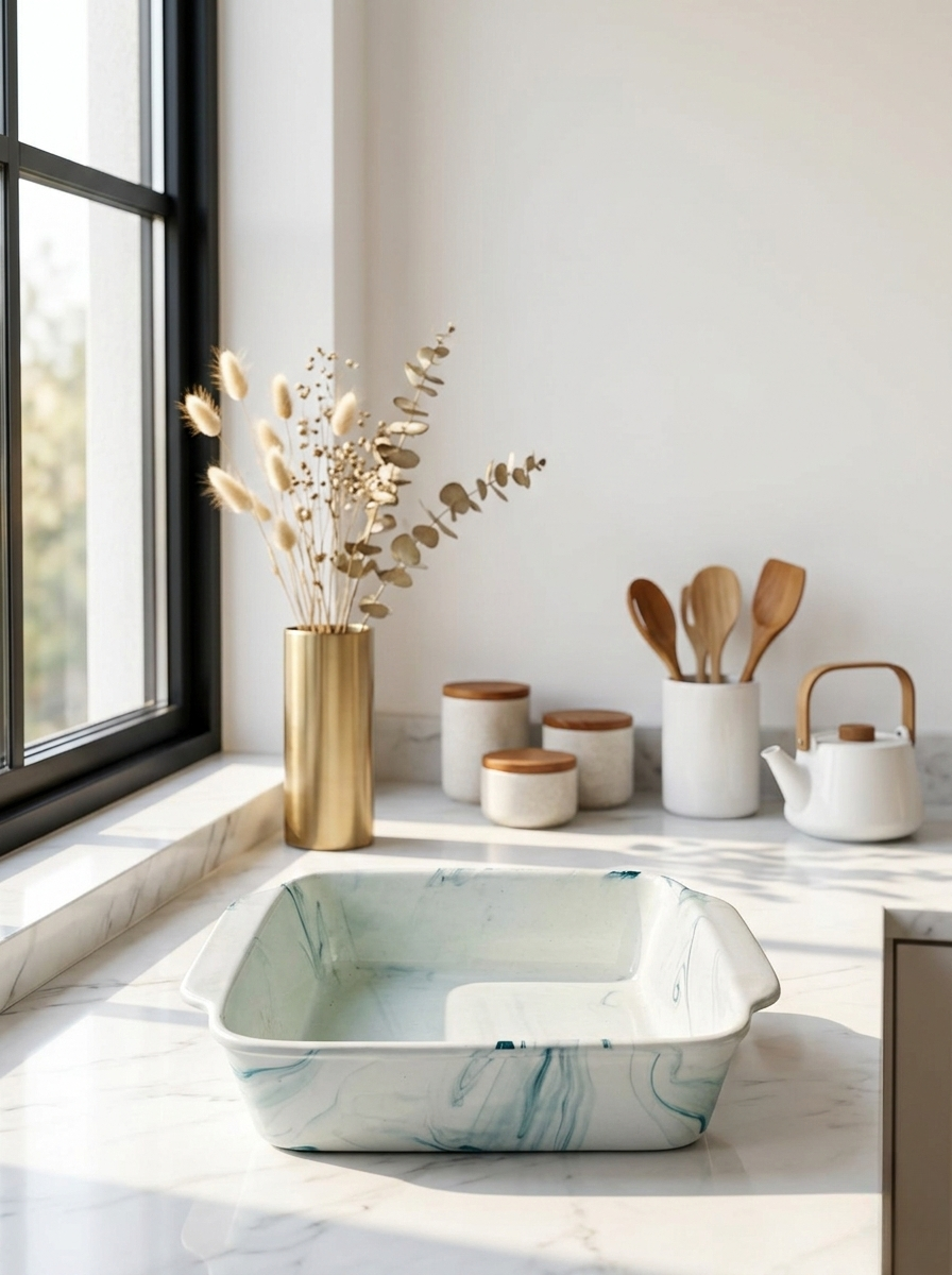 A beautifully crafted serving and baking dish featuring an elegant green marble pattern that adds a refined touch to any table. Designed to combine practicality with modern style, it is perfect for presenting fruits, desserts, baked dishes, or everyday meals.