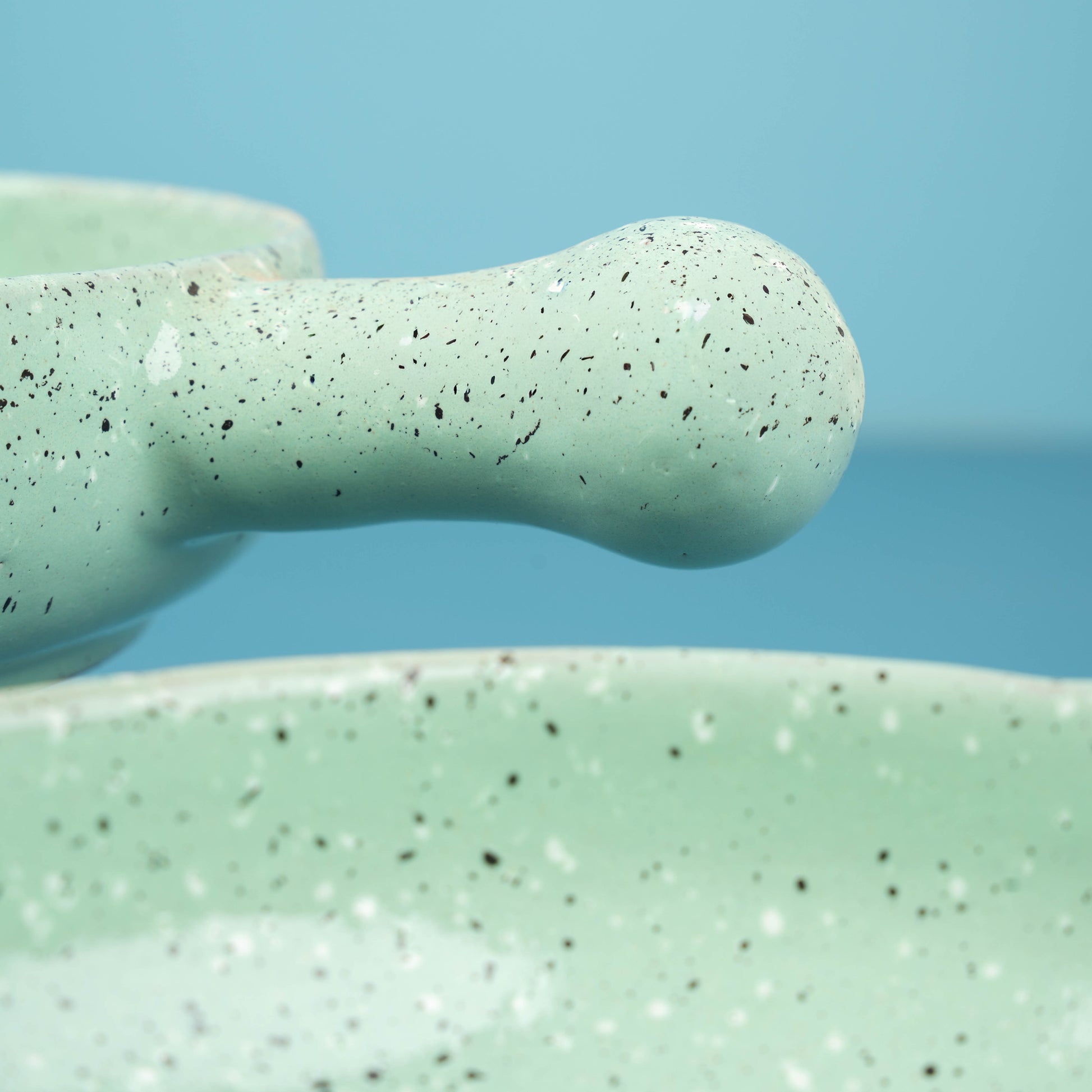 Design: Soft mint green glaze with delicate speckled texture; rounded form with integrated handle