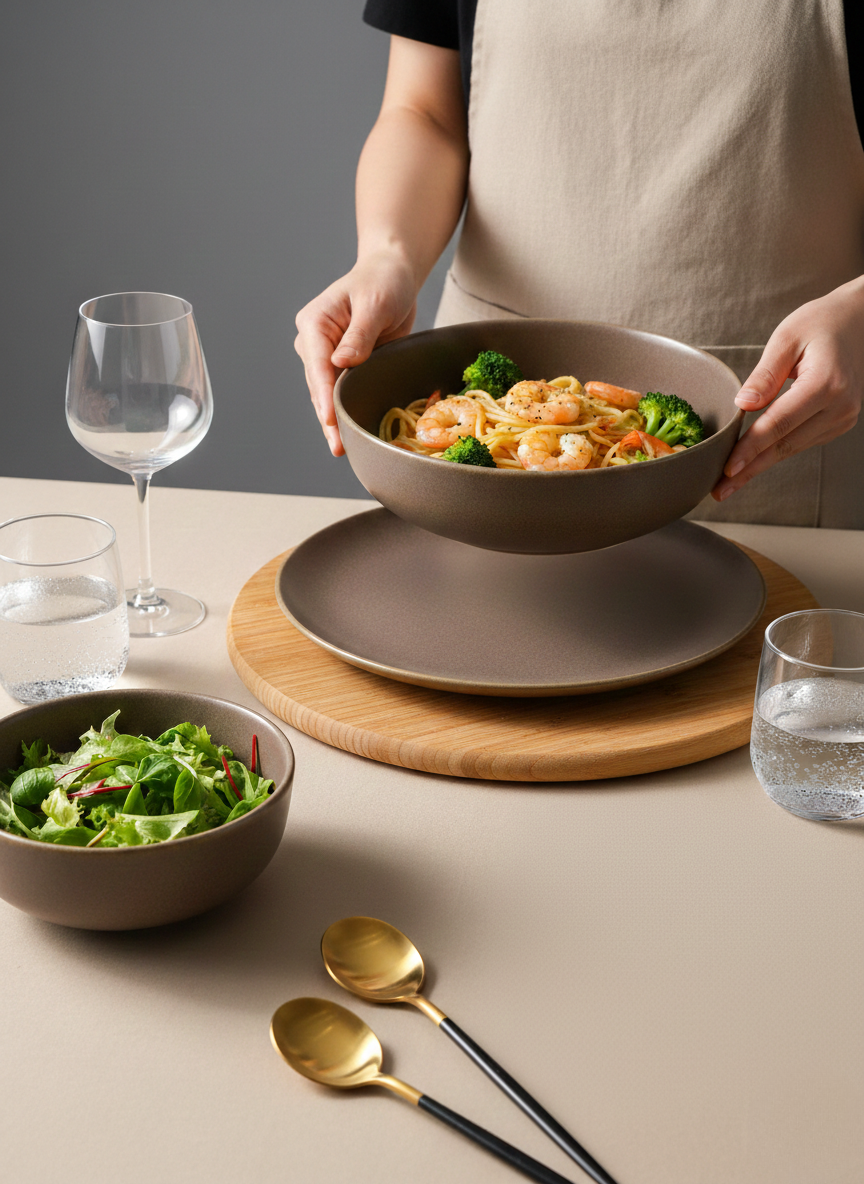 A modern dinnerware collection featuring a smooth matte mocha finish and softly rounded forms. Designed to bring warmth and understated elegance to everyday meals and special gatherings, this set blends contemporary style with practical durability.