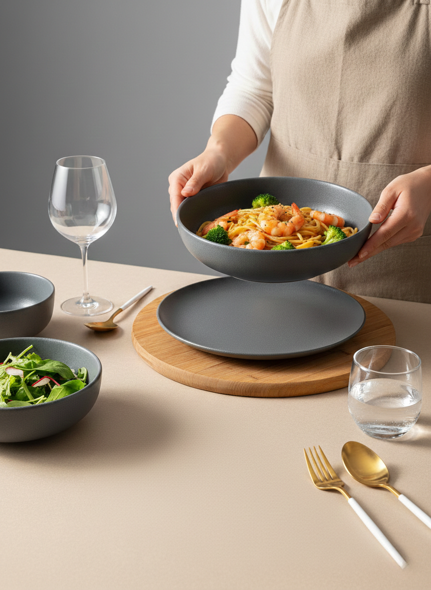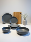 A contemporary dinnerware collection inspired by natural stone tones, featuring a smooth matte gray finish and clean, rounded silhouettes. Designed to complement modern tables while offering everyday durability and versatility.