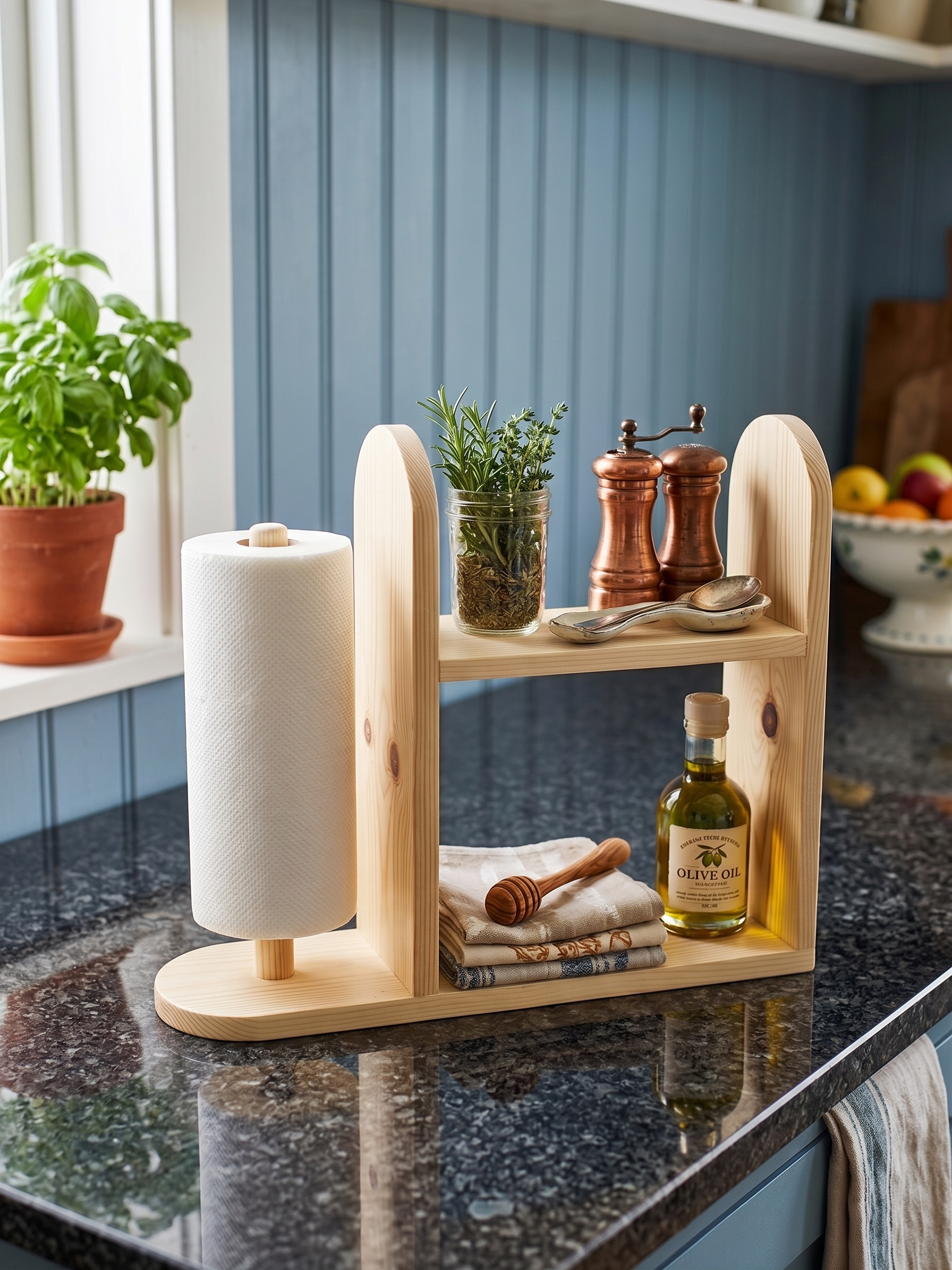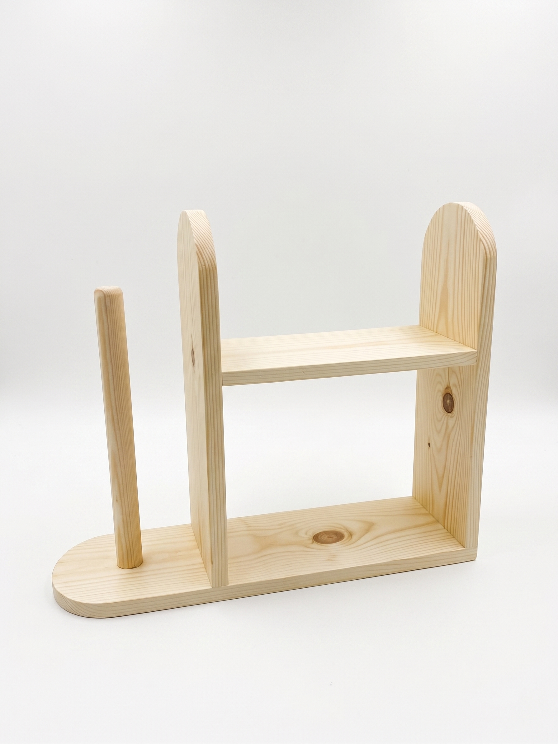 The Portal Wood Unit is an all-in-one kitchen or workspace organizer designed for those who appreciate functional, natural aesthetics. This clever unit combines a vertical paper towel or roll holder with a two-tiered shelving system, featuring soft, arched "portal" silhouettes that add a gentle, modern touch to your countertop.
