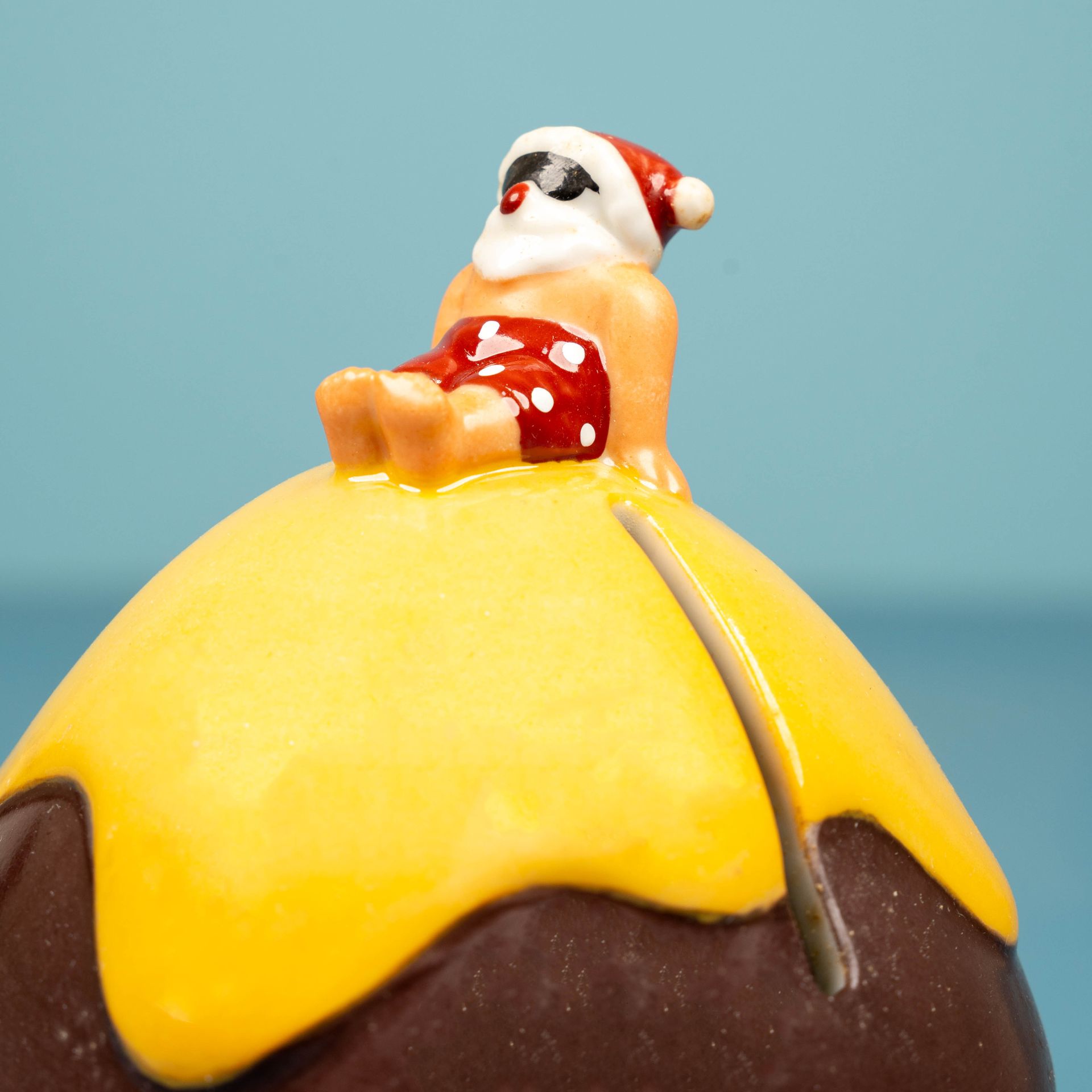 Design: Festive cupcake shape with a striped base, chocolate-drip top, and a mini Santa resting on the lid — perfect for holiday décor or gifting.