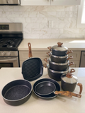 A complete cookware set designed to handle all your everyday cooking needs. Featuring a durable granite non-stick coating and elegant wood-style handles, this set combines performance, durability, and modern kitchen aesthetics.