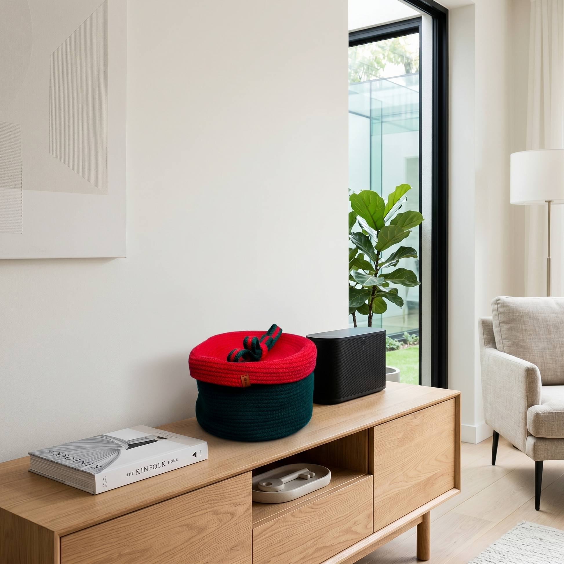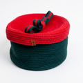 Design: Round woven basket with a contrasting rim and decorative loop detail for a festive, modern touch.