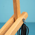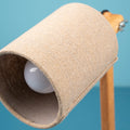 A minimalist desk lamp combining natural wood and fabric for a warm, modern look.